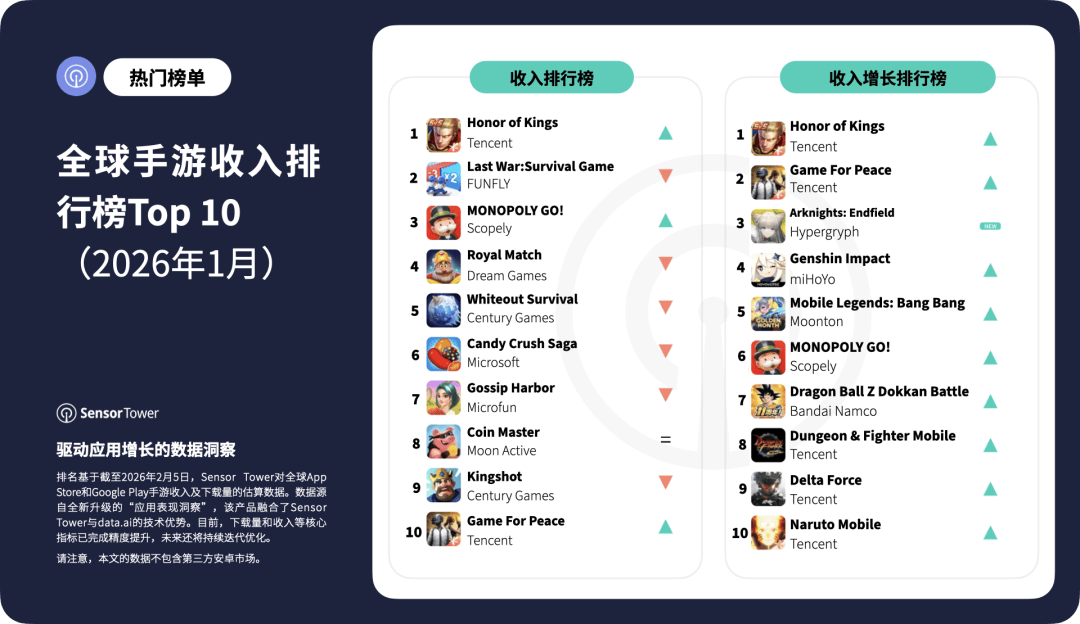 近日,Sensor Tower公布了2026年1月全球手游收入排行榜TOP10。2026年1月,全球玩家在 App Store 和 Google Play 手游上的支出达到71亿美元,环比增长1.4%。其中,美国市场以31%的总收入占比继续领跑,中国(仅iOS)和日本市场则分别以16%和13%的份额紧随其后。《王者荣耀》在2026年1月表现强劲,重返全球手游收入榜榜首。紧随其后的是《Last War: Survival Game》、《MONOPOLY GO!》、《Royal Match》以及《Whiteout Survival》,共同跻身全球前五。