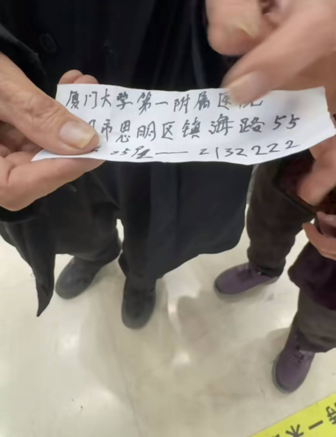 “嗜糖”带老人去了门诊和急诊,两位老人一口河南方言,爷爷听不清,奶奶不识字,造成就医不便,网友便帮他们与急诊医生沟通。急诊医生建议还是明天挂骨科,网友在离开前把两位老人托付给了急诊门口的派出所,“爷爷名叫海水,希望这次来厦门可以看到属于他的海水。”