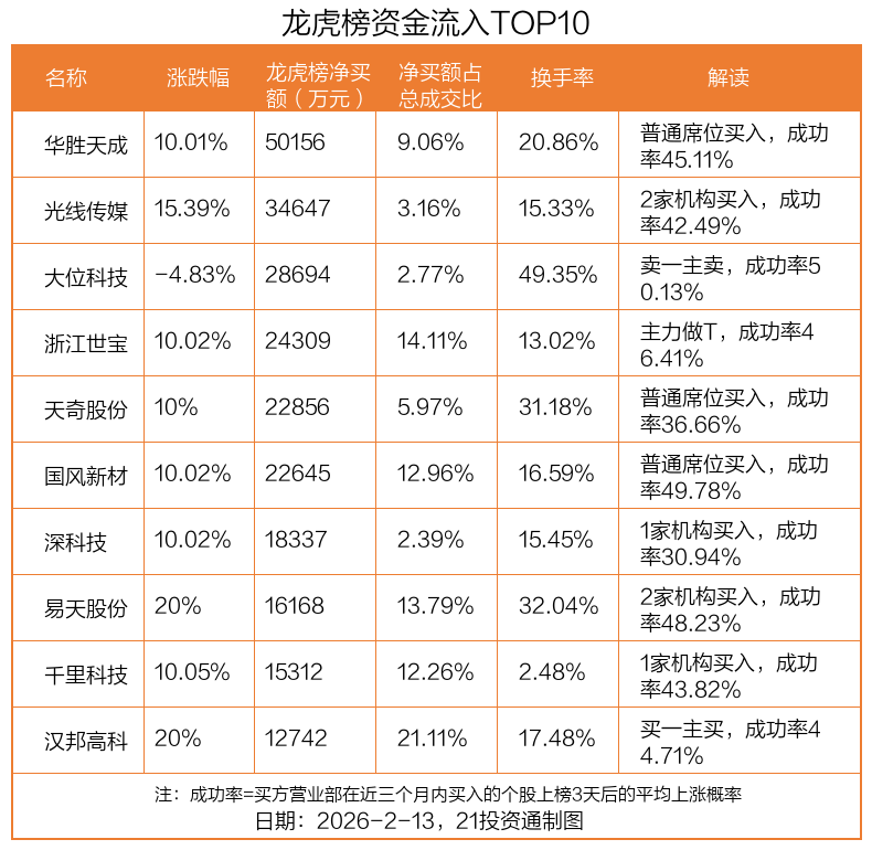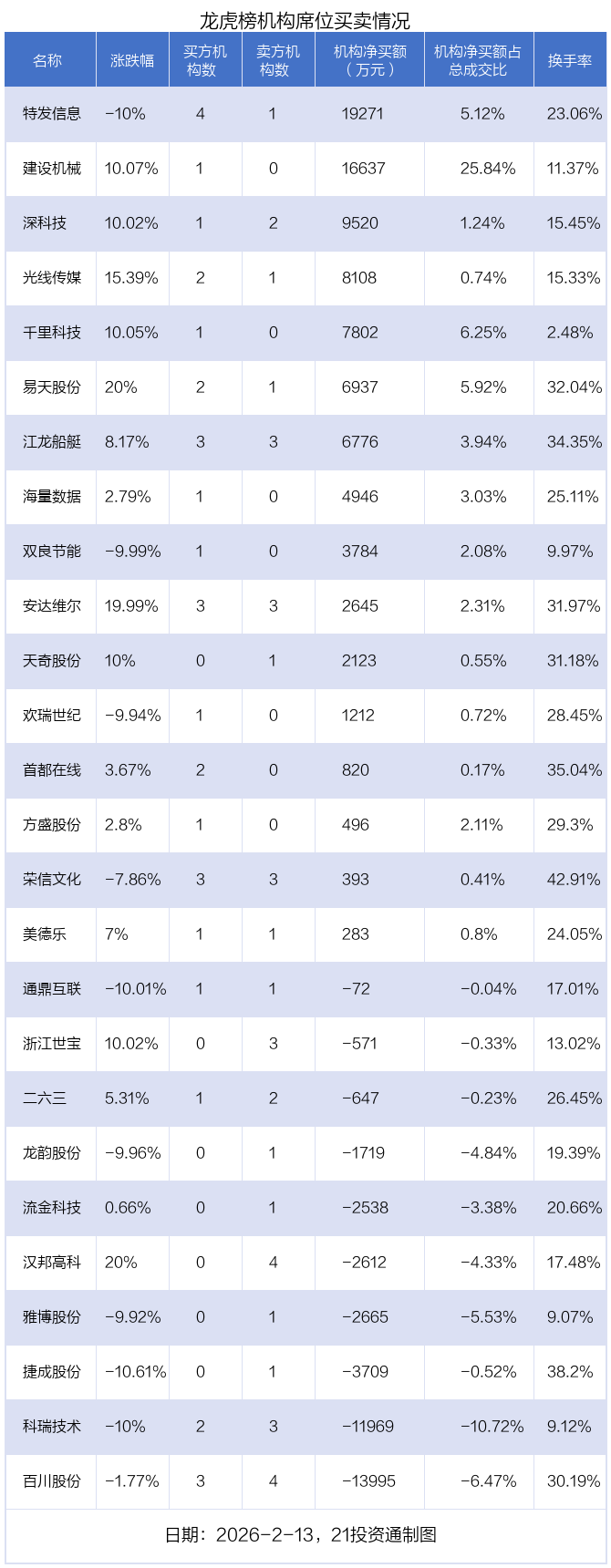 2月13日,26只个股龙虎榜出现了机构的身影,机构合计净买入5.13亿元。具体来看,机构净买入16股,净卖出10股。