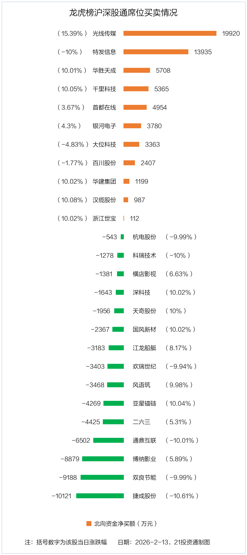 2月13日,北向资金参与龙虎榜中的个股共有26只,合计净卖出877.56万元。其中沪股通净买入4 股,净卖出5 股,合计净卖出3214.91万元;深股通净买入7 股,净卖出10 股,合计净买入2337.36万元。